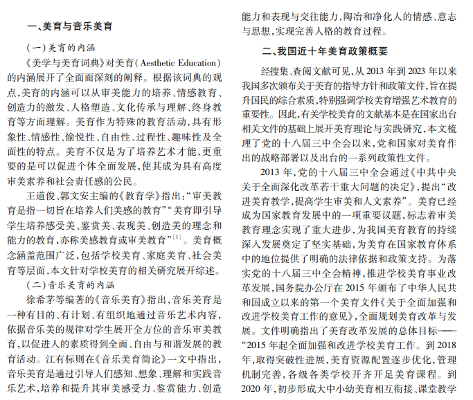 随着人们对美好生活的追求不断提高,美育逐渐受到高度重视。音乐美育作为美育的重要组成部 分,在促进学生全面发展、提高学生综合素质方面起着不可替代的作用。本文以 2013—2023年为时间节点,分 析中国知网 185篇文献,总结音乐美育实施的研究成果,以期对音乐美育教学实践提供参考价值。