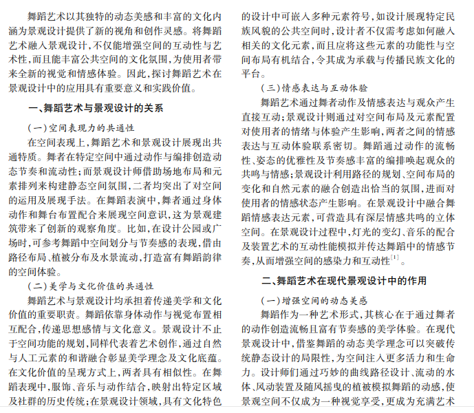 在现代景观设计中,舞蹈艺术通过动态雕塑、主题公园设计、地面铺装与数字技术的融合,创造出 具有强烈视觉吸引力和文化深度的公共空间。案例分析表明,融合舞蹈艺术的景观设计显著提升了公共空间 生态美学,展现了景观设计的创新方向和巨大潜力。