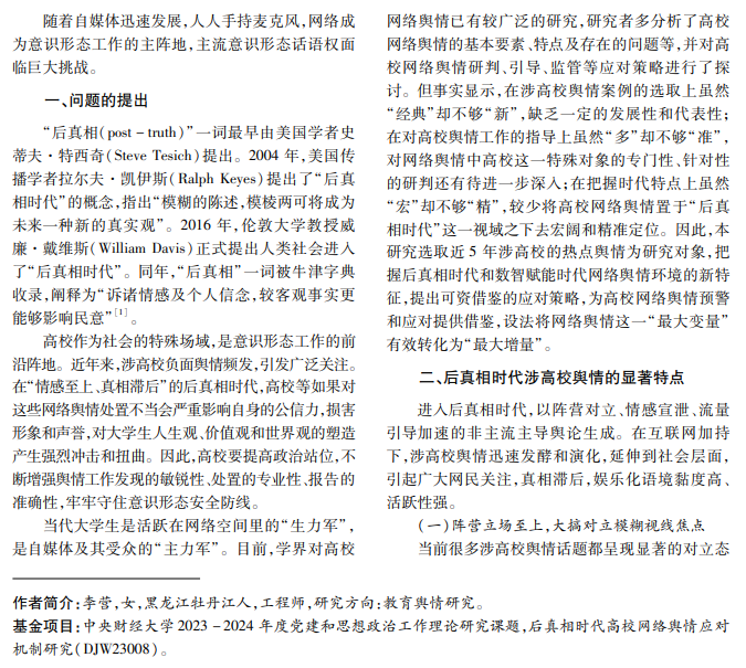 随着自媒体成为信息传播的重要渠道,以及“情感至上、真相滞后”的后真相时代到来,主流舆论受 到巨大冲击。近年来,高校舆情多呈现“阵营立场至上、情感宣泄至上、资本流量至上”等特点,致使舆情发酵演 化迅速,高校意识形态工作迎来前所未有的挑战。高校舆情事件频发,主要源自话题高度敏感、内容泛娱乐化、 受众群体极化、涉事主体处置不当、媒体推波助澜等。为解决此类问题,本文试图从高校舆情工作的准备、渠 道、事件、角色等维度提出应对策略,以提高高校公信力和影响力,守住高校意识形态安全。