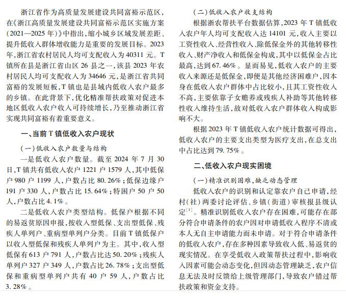 促进低收入农户精准帮扶与乡村振兴有效衔接,巩固低收入农户全面小康攻坚成果,对浙江高质 量发展建设共同富裕示范区十分重要。本文以浙江省 T镇为例,通过统计数据和走访调查,分析低收入农户状 况及现实困境,结合乡村振兴政策提出精准帮扶对策,旨在为拓宽低收入农户增收渠道、提升低收入农户生活 水平提供可行建议。