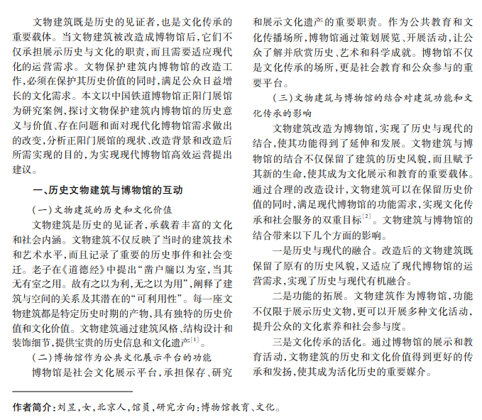 相较于普通博物馆内部改造,文物保护建筑内博物馆改造具有复杂性和局限性。随着时间推移, 旧有博物馆的内部基础设施逐渐无法满足现代博物馆的运营需求,迫切需要展开适应性改造。本文选取位于 天安门广场东南侧的中国铁道博物馆正阳门展馆作为案例,详细介绍该建筑改造的背景、施工过程中遇到的主 要挑战及解决对策,探讨如何在保护和利用历史文物建筑的同时,满足现代博物馆的运营需求。