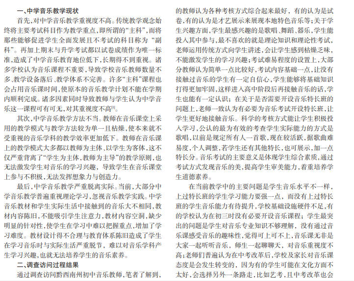 随着教育改革的深入,教育体系越来越完善,素质教育特别是艺术素质教育的改革呼声也越来越高。因 此,为了培养高素质的人才,需要不断调整中学音乐课的内容、性质、课程数量,以满足素质教育发展的要求。进入 21世 纪以后,对中学艺术类课程的改革更加深刻。文章分析贵州省某学校的访问结果,结果显示,虽然音乐中考还是采用试 卷的形式,以理论知识为主,视唱为辅,但音乐加入中考后具有重要的价值与作用。