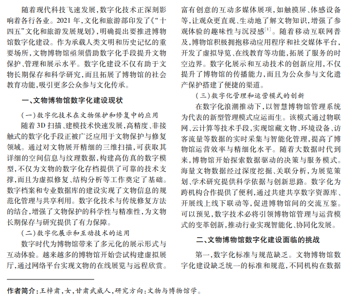 文物博物馆是保护和传承人类文明的重要载体。近年来,数字化技术在文物博物馆中得到广泛应 用,促进了文物保护、展示和传播。文物博物馆数字化建设是一项长期而复杂的系统工程,需多方合作、协同创 新。本文分析国内外文物博物馆数字化建设现状,总结其面临的主要挑战,在此基础上提出推进文物博物馆数 字化建设的对策建议,并展望文物博物馆数字化建设趋势。