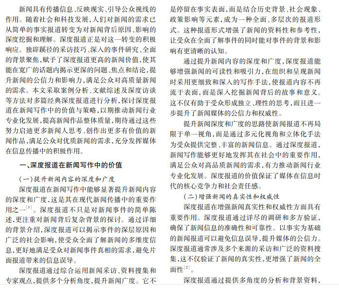 深度报道能够深入挖掘新闻事件背后的原因和影响,提供翔实的背景资料和多角度分析,使读者 更全面、深入地了解新闻事件,从而提升新闻的公信力和影响力。本文通过对多篇经典深度报道文本的分析, 结合新闻写作的理论和实践,总结深度报道在新闻写作中的核心要素和有效策略。