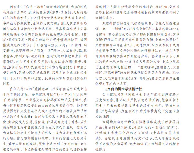 大型舞台音乐剧《追梦·青春》经过近一年半的酝酿与打磨,通过 2019年 4月大连开发区大剧院的动人首 演,5月沈阳盛京大剧院的二次华丽亮相,到 6月北京人民大会堂的精彩绽放,获得了国家级及省市各级新闻媒体和专 家学者的高度赞誉。本文主要从音乐创作入手,从音乐美学的角度来进行研究,以期能够对《追梦·青春》的音乐艺术特 点进行归纳,进而丰富该作品的理论研究成果。