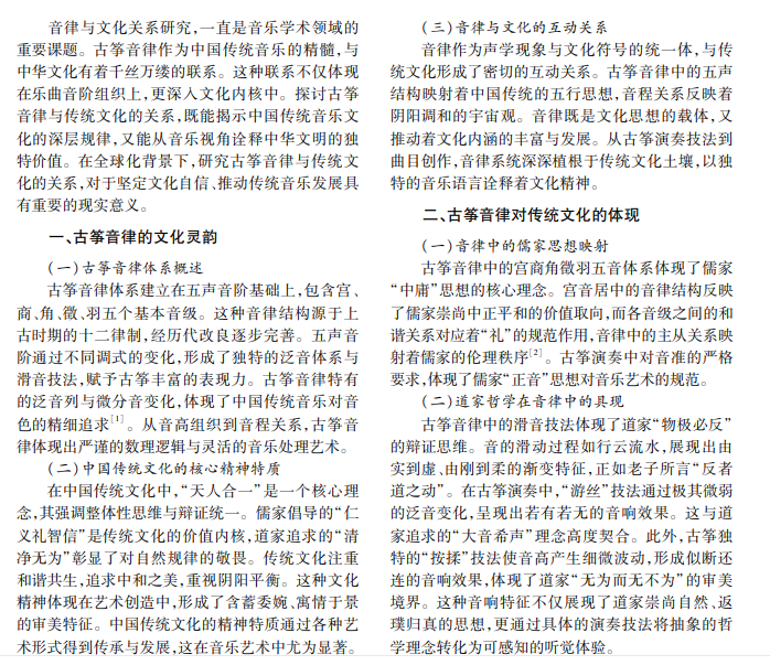 古筝作为中国传统乐器的代表,其音律体系与中国传统文化密不可分。本文通过考察音律中儒家 “中庸”思想、道家“天人合一”理念及佛教文化的渗透,揭示古筝音律与传统文化的深层互动关系,为新时代文 化传承提供启示。