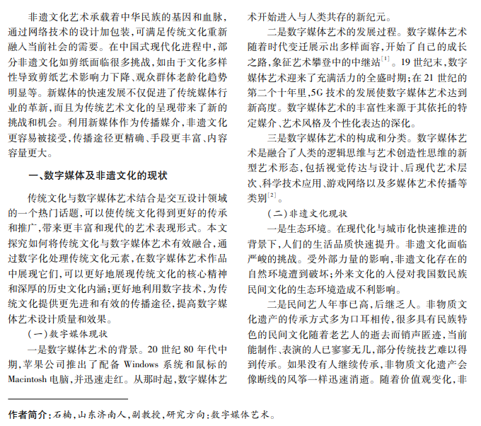 数字媒体艺术是随着数字科技进步而兴起的艺术样式。目前,数字媒体交互艺术作为一个前沿话 题,依托于创新技术,为传统非遗艺术注入了新活力。数字媒体交互艺术倡导观众加入创作,与艺术作品形成 情感互动,消除艺术与人的界限,缩短艺术家、作品与观众的距离,满足现代社会对非遗文化的感知需求。