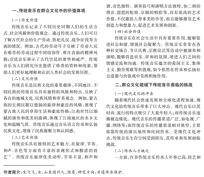 群众文化是社会主义文化建设的重要组成部分,涵盖了广大人民群众在日常生活中创造、传承的 各种文化形式。传统音乐是人类宝贵的文化遗产,在群众文化视域下,深入挖掘传统音乐的价值,并采取有效 的弘扬举措,对于传承和发展中华优秀传统文化、丰富群众精神文化生活、增强民族文化自信具有重要意义。 本文重点研究群众文化视域下传统音乐的价值挖掘与弘扬举措。