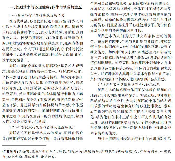舞蹈作为全身运动,通过肢体动作缓解压力、调节情绪和增强自我效能感。作为文化传承工具,舞 蹈不仅可以增强个体的文化认同,而且可以促进跨文化沟通。研究舞蹈对情感调节的短期和长期效果,有助于 促进心理健康,提升社会适应能力。在全球化背景下,舞蹈在文化交流和心理疏导中的作用日益重要。本文探 讨舞蹈艺术在心理健康和文化认同中的作用。