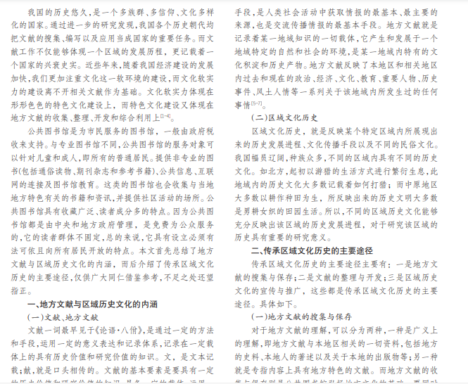 地方文献记载着地方文化的发展史。地方文献的收集、整理和利用,有助于推动地方特色文化的继承和传 播。各级文献机构应当重视地方文献的开发,统筹书面文献和口头文献,建立具有本地特色的地方文献数据库,以加强地 方两个文明的建设。本文从公共图书馆中地方文献入手,展现其应有的作用,来确保地方区域文化历史能够得以传承。