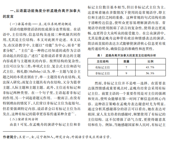 本文以韩礼德的语言功能理论为基础,选取孟晚舟的讲话作为研究对象,从概念功能、人际功能和 篇章功能三个方面对其进行分析,阐述演说文体有别于其他文体的主要功能特点,并从孟晚舟讲话的言语规律 入手,探索言语选择和语义表现的内在关联,建立说者与听者的交互关系,提高对言语把握敏感度。
