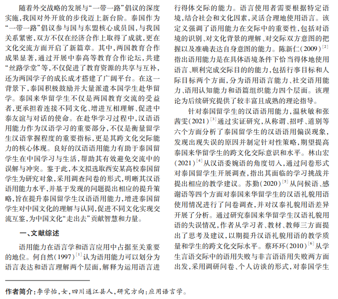 汉语作为中国的官方语言和文化载体,是来华留学生必修技能。本研究聚焦泰国来华留学生群 体,通过问卷调查分析泰国留学生汉语语用知识掌握状况。基于研究结果,本文提出对应的提升策略,以期促 进跨文化交流的有效开展。
