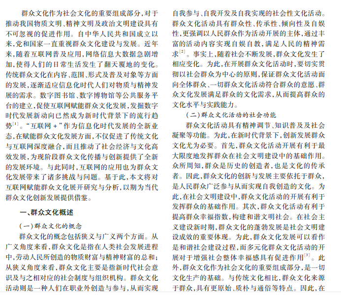 互联网背景下的群众文化更广泛、平等与兼容,且内容与形式更丰富。本文对互联网赋能群众文 化发展展开研究,简要概述群众文化的内涵与社会功能,分析互联网技术赋能群众文化发展转型,并对群众文 化发展中面临的问题及其优化策略进行探究。