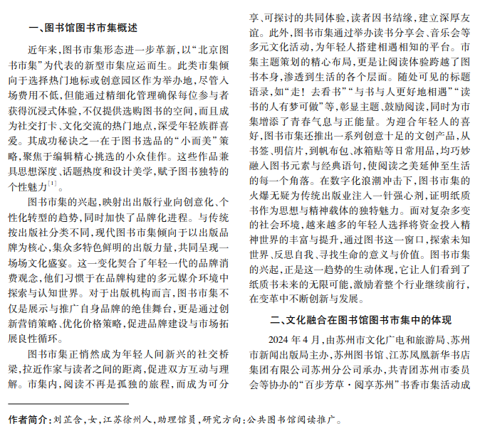 苏州图书馆始终秉承“传承文明、服务社会”的理念,积极探索图书市集服务模式。该馆精心策划 的图书市集融合了传统文化与现代元素,开展了一系列创意阅读推广活动,提升了读者的参与度和体验感。本 文以苏州图书馆图书市集为例,分析图书市集中文化融合与创新传播的做法和成效。