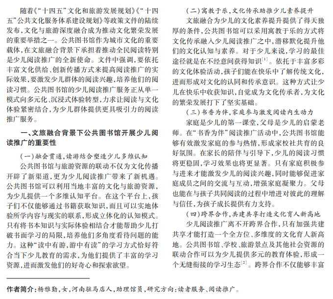 在文旅融合背景下,公共图书馆少儿阅读推广工作面临新的挑战与机遇。当下,少儿阅读推广正 逐步从传统模式转向多元化、互动化的创新路径。本文围绕文旅融合实践,探讨公共图书馆在少儿阅读推广中 的问题,并提出转型创新的策略。