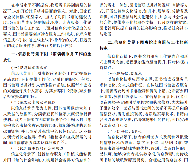 信息化背景下,图书馆应该主动迎合全面学习倡议,为读者提供文献和资源支持,助力文化建设工 作顺利开展。图书馆要创新读者服务工作模式,利用信息技术手段,迎合读者的个性化需求,营造现代化的学 习和阅读环境,使读者感受阅读的快乐。本文从信息化背景下图书馆读者服务工作的重要性出发,分析读者服 务工作的新特点,提出优化策略。