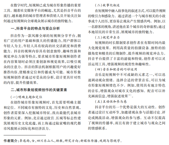 在数字时代,城市形象短视频成为展示城市形象的高效媒介。城市形象短视频创作采用故事化叙 述和视觉冲击力强的画面,通过音乐和互动性增强观众参与感,成功案例如杭州,通过展示自然美景和文化底 蕴获得广泛关注。面对文化适应性和内容创新的挑战,创作者需利用新技术和精准定位,提升短视频吸引力和 传播效果。