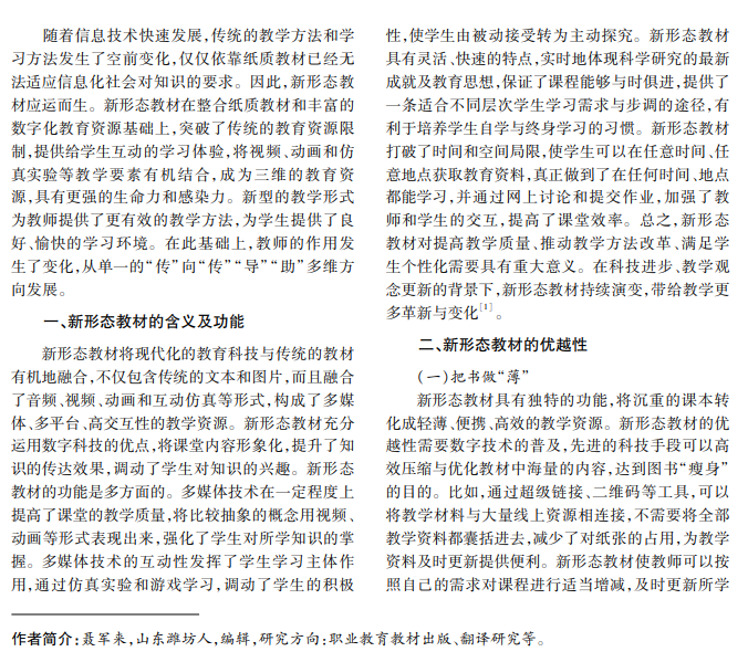 近年来,随着教育信息化迅猛发展,学生的学习习惯发生了巨大改变。新型教材将传统教材与传 统的电子教材结合,呈现崭新的面貌。采用新形态教材,既能充实知识,又能调动学习兴趣,提升课堂教学效果 与品质。本文结合笔者实践,剖析目前新形态教材的三种主流形式。三种新形态教材各具特色,充分满足了学 生的实际需要,促进了教育资源高效使用和教育平等。