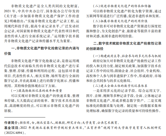 本文通过分析非物质文化遗产数字化记录的内涵与价值,强调数字技术在非物质文化遗产保护中 的重要作用,并选择濒临失传的非遗汉口码头号子作为典型案例,深入探讨多种数字技术手段应用于汉口码头 号子转录与存储、传播与体验、开发与设计等方面的创新路径。