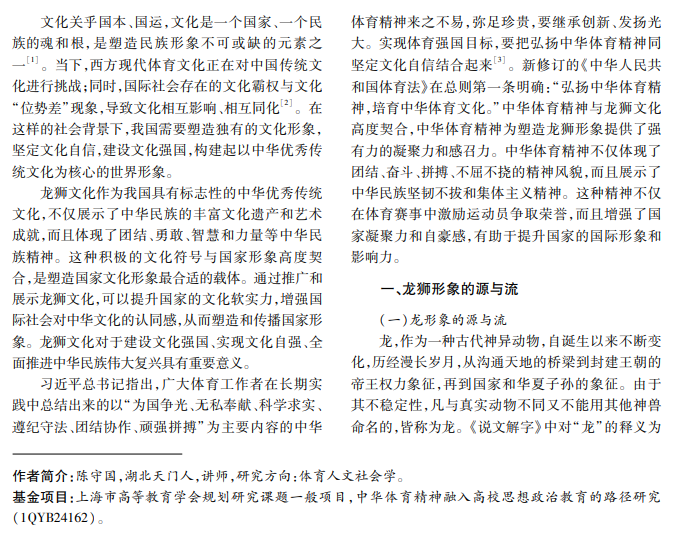 将中华体育精神融入龙狮文化,在塑造以传统文化为核心的国家形象中具有重要的引领作用。中 华体育精神融入龙狮文化是我国坚定文化自信、建设文化强国的有效举措。本文通过梳理龙狮文化形象的演 变,探讨其代表国家形象的可行性。