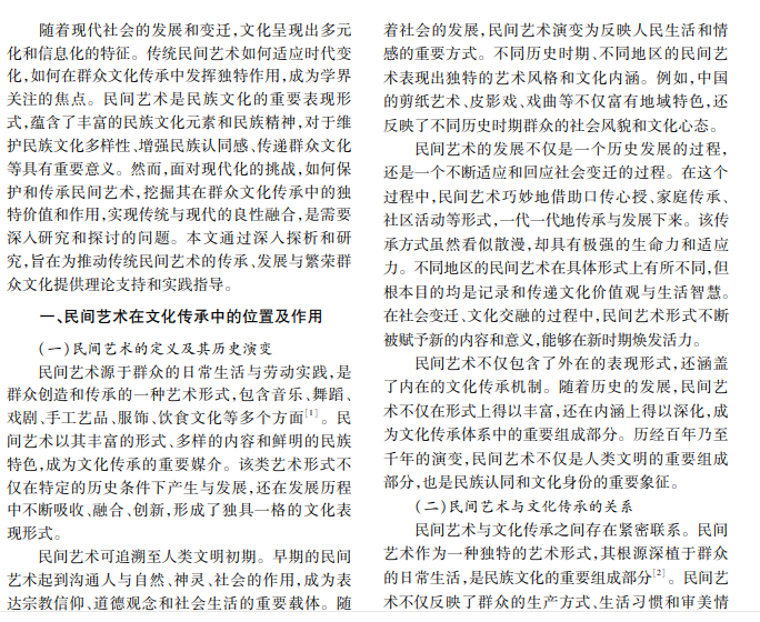 现代社会文化呈现出多元化和信息化的新局面,本研究以民间艺术传承为切入点,论述当代民间 艺术在群众文化传承中的重要角色。通过考察和剖析,认为民间艺术是民族文化精华的载体,是群众文化传递 的重要方式,对于增强民族认同、保护和弘扬民族文化具有举足轻重的作用。