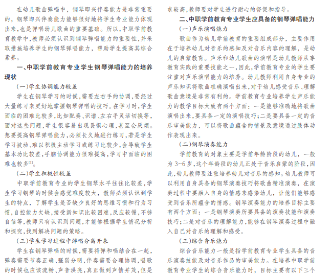 在中职学前教育专业中,钢琴弹唱能力是非常重要的,幼儿钢琴弹唱能力是幼师必须具备的技能。笔者主 要分析了当前中职学前教育专业学生钢琴弹唱存在的问题,并在此基础上提出了问题解决的策略,希望能够切实提高 中职学前教育专业学生的钢琴弹唱能力,给其将来的就业奠定良好的基础。