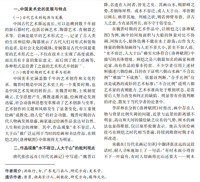 魏晋时期“水不容泛,人大于山”现象,如顾恺之《洛神赋图》所示,是艺术家表达情感和个性的方 式。然而后世许多学者批判“水不容泛,人大于山”作品现象,以此判定顾恺之乃至魏晋时期的绘画艺术水平不 高。本文从批判观点入手,重新分析“水不容泛,人大于山”现象,肯定其艺术价值,重新评估其在中国美术史中 的地位,探讨其当代社会价值。