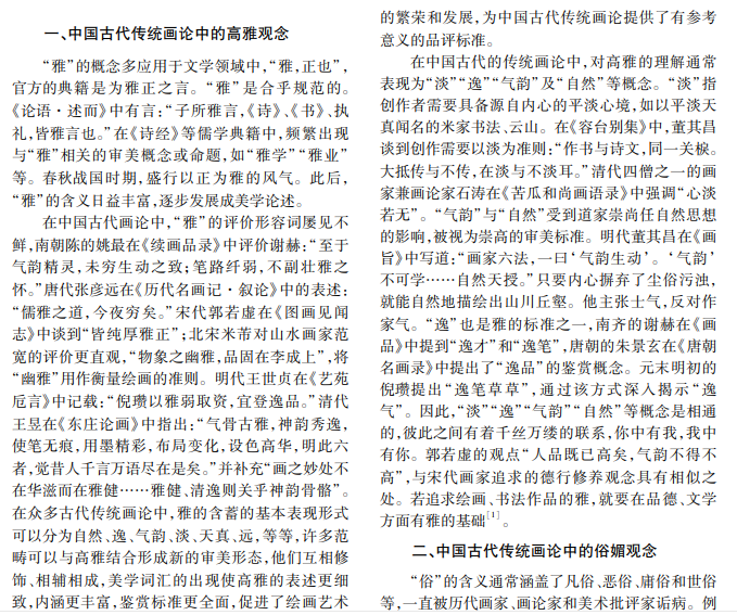 在中国传统画论的评价标准中,高雅和俗媚各具内涵。高雅被视为崇高特质,是主要审美标准之 一,俗媚被视为大忌,甚至遭受轻蔑。避免创作偏向俗媚、创作高雅的作品是古往今来文人画家探索的重要方 向。本文研究中国古代画论中绘画创作的高雅与俗媚,探讨如何理解两者的关系。艺术批评的视角不应简单 地停留在高雅或媚俗的维度,而应该考虑多方因素。