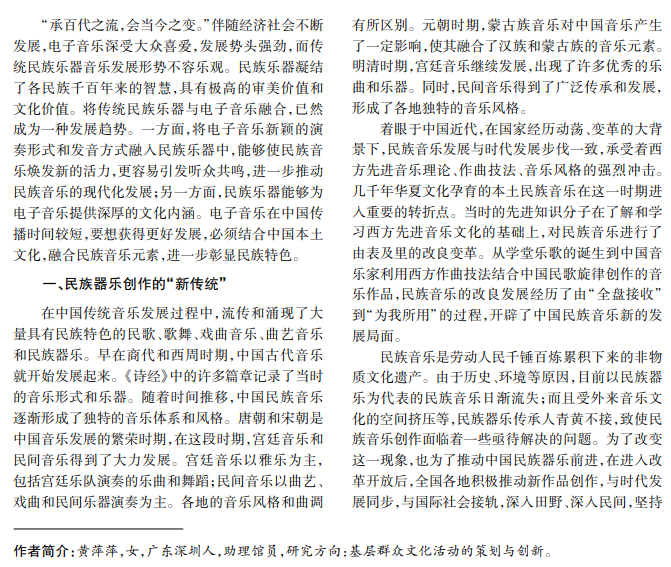 乐器作为中华传统音乐文化中的代表性存在,已成为中华民族文化符号,其丰富的艺术表现力有 待进一步挖掘。在全球文化交融的背景下,传统乐器、音乐与当代音乐体系相互融合表达,为传承民族音乐文 化提供了支持,更为现代音乐体系的发展提供了创新路径。本文通过分析民族器乐创作的“新传统”和民族器 乐与电子音乐的创新融合,提出民族乐器与电子音乐融合下传统音色在现代音乐制作中的新维度,推动中国民 族乐器与电子音乐融合发展。