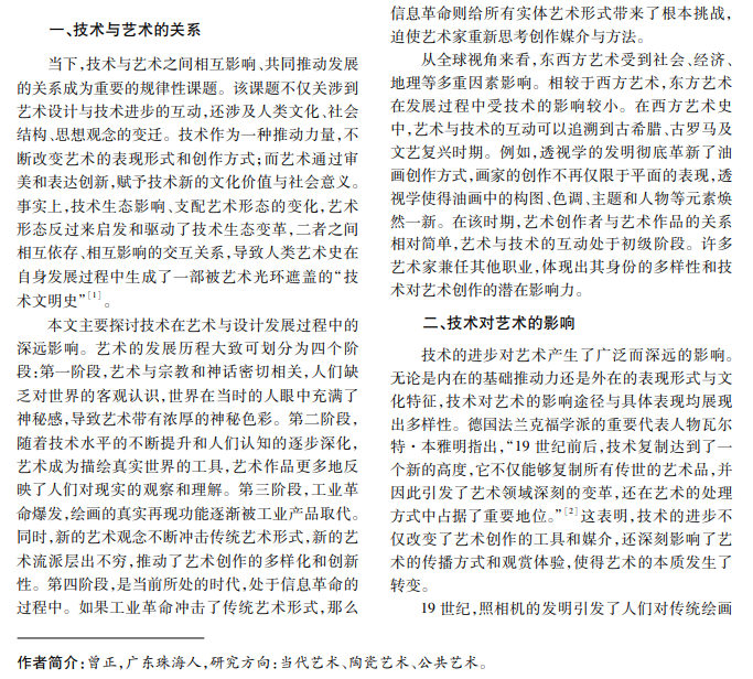 作为艺术设计的重要工具与手段,技术在推动艺术设计发展中扮演着关键角色。本文重点探讨西 方艺术设计在技术推动下的发展历程,并按照时间线进行梳理,分别概述 19世纪技术与艺术设计的交互关系, 以及 20世纪西方国家呈现的全新艺术设计面貌,最后通过对中国著名艺术家隋建国的创作实践分析,探讨技 术进步如何影响中国艺术家创作手段的选择及艺术表达的演变。