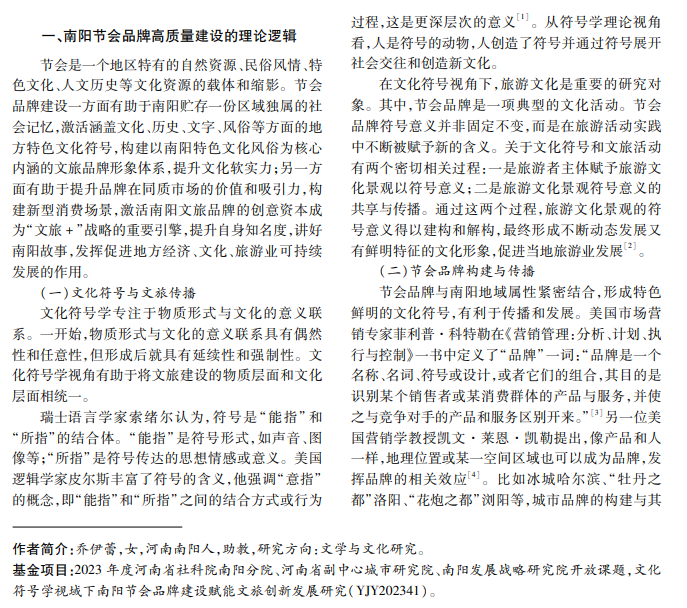 随着节会文化不断发展及人们精神文化需求提高,具有南阳地域特色的节会跟随时代发展步伐, 打造具有记忆点的南阳文化符号和树立南阳节会品牌形象,实现南阳文旅可持续发展。本研究基于节会文化 与南阳市特色地域文化,从文化符号学视角研究节会文化品牌建设,深入挖掘南阳文化的历史内涵和精神特 质,着力推广以节会为载体的文旅品牌,总结梳理国内成功办会经验,为助力南阳市文旅产业发展创新提出可 行性建议。