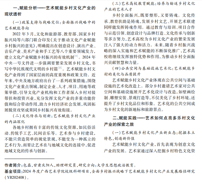 在乡村振兴战略背景下,艺术成为乡村文化产业发展的关键,通过艺术文化内涵、旅游体验和品牌 建设为乡村赋能,但当前仍存在艺术文化传承乏力、艺术基础薄弱、艺术教育普及不足、资金人才短缺、融资渠 道单一等难题。应采取强化人才支撑、加强传统传承、夯实产业基础、普及艺术教育、拓宽融资渠道等方式,促 进艺术赋能乡村文化产业发展。
