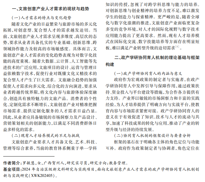 本文深入探讨面向文旅创意产业人才需求的政产学研协同育人机制,分析机制现状与挑战,提出 创新性优化策略与发展方向。通过政府引导、产业驱动、学校主体与科研机构深度融合,构建高效协同的育人 体系,培养符合市场需求的高素质人才,推动文旅创意产业持续健康发展。