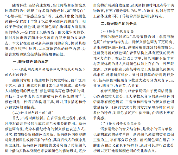 近年来,网络商业领域及网络流行语中涌现了大量新兴颜色词。本文以普通语言学、词汇学、文化 语言学及比较语言学等学科理论为基础,对新兴颜色词类型、特点及产生原因等进行探索性梳理分析,探索其 在语言使用上的特点及现代汉语词汇发展规律,并分析其背后所隐藏的文化特征与大众心理。