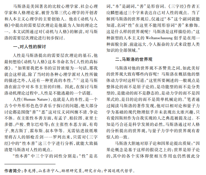 马斯洛在《动机与人格》中提出了著名的需要层次理论,对于心理学和管理学影响深远。本文试图 通过马斯洛对人性的探讨,分析他诠释人性时运用的世界观与量子力学的世界观相吻合之处,并根据这一世界 观指出他对人性的探讨,基于此建构的需要层次理论的合理之处,指出需要层次理论在经济层面上有失虑之 处,但在管理学领域具有很高的理论指导意义。