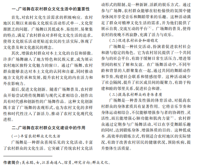 随着中国农村地区经济快速发展和生活水平不断提高,农村群众对精神文化生活的需求日益增 长。广场舞作为一种低成本、高参与度的群众性文化活动,在农村地区迅速普及,成为农村文化建设的重要组 成部分。本文主要探讨广场舞在农村群众文化建设中的地位和作用,分析其在丰富农村文化生活、促进社会和 谐、提高群众身体素质、增强凝聚力及传承中华优秀传统文化方面的积极影响,并提出相应发展策略。