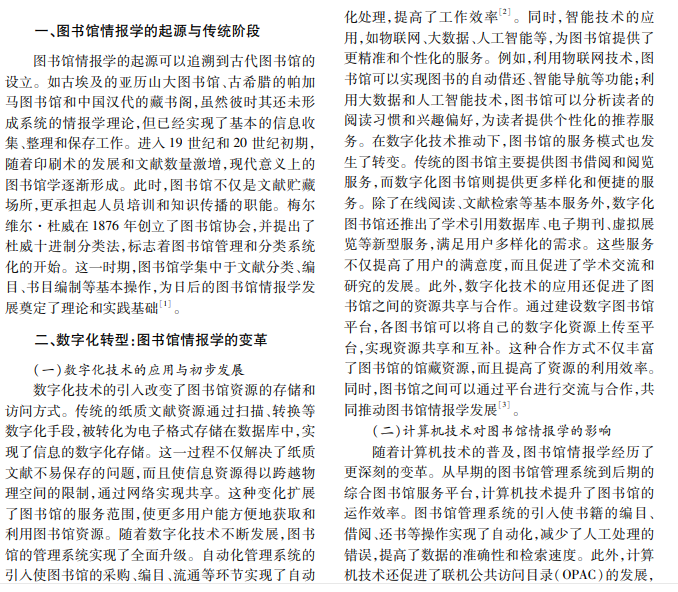 图书馆情报学在数字技术推动下经历了变革。本文回顾并探讨图书馆情报学的发展历程与演变, 通过梳理图书馆情报学从传统纸质时代向数字化、网络化、智能化转变的节点,分析数字技术对图书馆情报学 的影响及其未来发展趋势。