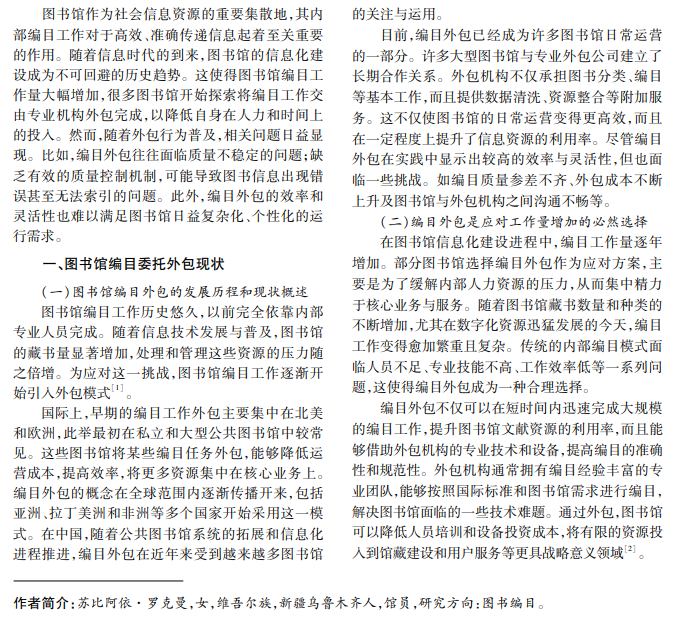 图书馆编目工作外包可以减轻图书馆压力,但也存在质量不稳定、难以适应图书馆运行需要等问 题。建立和完善编目外包的质量控制机制、加强与外包机构的沟通、注重团队培训是本文提出的应对策略。在 选择外包合作伙伴时,图书馆应综合考虑其专业技术水平、服务质量和成本效益,并与外包机构建立长期合作关 系。编目外包只是补充,不能全面取代图书馆编目工作。图书馆应结合自身实际,科学应对,实现效益最大化。