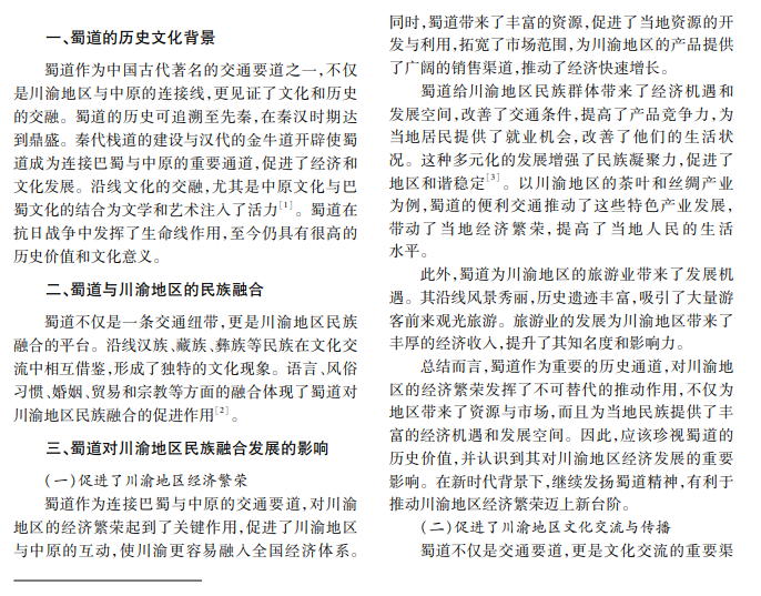 蜀道是连接关中与巴蜀的关键交通要道,对川渝地区的民族融合发展具有重要作用。本文通过分 析蜀道的历史、地理及文化影响,认为其促进了川渝与中原的交流,推动了文化交融发展。研究蜀道价值,有助 于理解其历史意义和促进区域一体化。