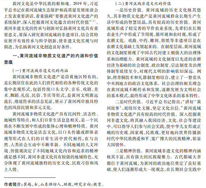 黄河流域作为中华文明的发源地之一,积淀了丰富的非物质文化遗产,承载了独特的精神特质。 本文结合黄河流域地域特点深入研究非遗文化,挖掘黄河流域非物质文化遗产的历史和时代价值,分析黄河流 域非物质文化遗产保护传承的现状和挑战,综合探究其传承创新策略,助推黄河文化遗产系统保护,传承弘扬 黄河文化。