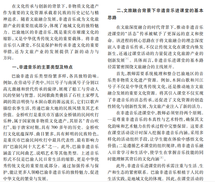 在文旅融合理念的指导下,教师通过课堂教学传承非遗音乐,既可以推动传统文化的活态保护,又 能激发学生对地方文化的认知与自豪感,进而促进文旅深度融合创新实践。本文介绍巴渝非遗音乐的类型与 特点,分析文旅融合背景下非遗音乐进课堂的基本思路,探讨文旅融合背景下非遗音乐进课堂的传承路径。