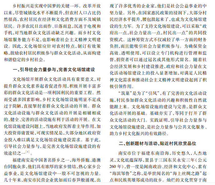 乡村文化场馆的建设与完善,可以激励乡村居民积极参加群众文化活动,培育文明乡风,是建设社 会主义精神文明的有效路径之一。本文研究乡村振兴视野下的文化场馆服务,提出乡村文化场馆服务策略与 举措,以期为社会主义精神文明建设作出贡献。