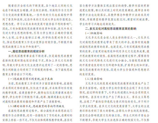 在新的发展背景下,我国网络和信息技术的发展给高校思想政治教育工作带来了不利影响,导致大学生 的思想观念也发生了很大的变化,影响了大学生人生观和价值观的树立。如果没有对网上的信息和内容进行有效的控 制和管理,很容易让大学生误入歧途,因此必须要加强对大学生的思想政治教育,从多元文化的背景出发,加强对思政 教育的创新和完善,为大学生的学习和成长提供正确的指导,让学生的思想政治观念不受影响和侵害。本篇文章主要分 析多元文化背景下高校思政教育的改革路径探究。