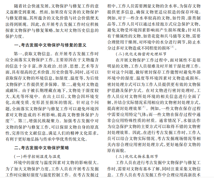 文物作为宝贵的文化遗产,是中华优秀传统文化的重要实证。然而,受环境、侵蚀等因素影响,文 物出现很多问题,如老化、褪色及损坏等。本文以考古发掘中文物保护与修复研究作为切入点,结合文物考古 发掘现场的实际情况,提出相关参考建议。