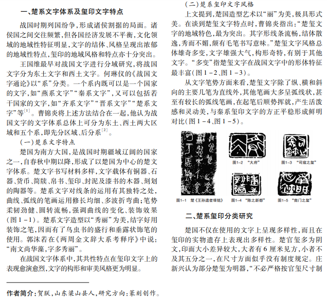 考释先秦玺印文字和确定先秦玺印时代的研究始于近世。截至目前,最大的研究成果侧重于其地 域性和印文内容考证,从美学体系角度对先秦玺印的论述着墨不多,这应作为一种新的课题研究方向。本文以 楚系玺印为例,研究其印文风格特点,结合笔者的古玺创作实践经验,从文字的简化、繁化、异化、同化、特殊符 号等方面研究楚玺文字的构形理念。