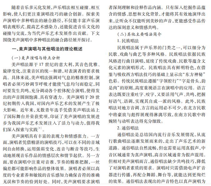 随着声乐艺术不断发展,美声与通俗唱法的界限逐渐被打破,唱法之间越来越多地展现出融合趋 势。本文分析美声演唱及其特点,介绍民族唱法和通俗唱法,采取理论与实例分析方法,提出美声演唱中多种 唱法融合的路径,为声乐演唱创新与发展提供参考。