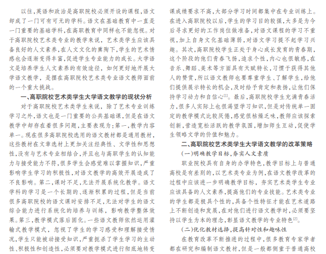 大学语文课程在高职院校艺术类专业教学中的地位不可忽视,传统的语文教学仍存在着很多问题,学生学 习兴趣不高,文学积累不够,自身素养没有得到提高,这不但降低了语文教学的有效性,而且对艺术类学生的专业学习 也会产生负面影响。因此,应该对大学语文教学进行积极探索改革,以夯实人文素养为教学目标,提高教学的针对性和 趣味性,教学内容应该尽量简单和贴近时代,还要运用多元化的教学形式,改革教学评价体系,提高语文教学质量。本文 针对高职院校艺术类学生的大学语文教学提出了改革思路,以供参考交流。