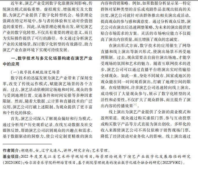 随着数字技术的快速发展,演艺产业面临前所未有的机遇与挑战。本文从场景理论视角出发,探 讨演艺产业的数字化转型路径。通过分析演艺产业的关键场景,如演出、营销及观众互动,揭示了数字技术在 提升用户体验、优化资源配置、创新商业模式等方面的重要作用。研究表明,演艺产业的数字化转型应侧重于 多元化场景构建、数据驱动决策和跨界合作等策略,以实现演艺产业的可持续发展。