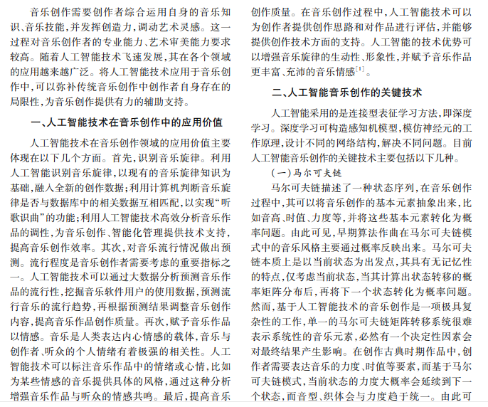 人工智能技术的飞速发展为音乐创作带来了全新契机。人工智能具有极高的数据处理与分析能 力,通过深度学习,能从海量音乐数据中提取有价值的信息进行音乐创作,为音乐家提供辅助与支持。人工智 能技术在音乐创作中的应用是目前一大研究热点。本文主要探讨音乐创作中人工智能技术的应用,分析人工 智能音乐创作的关键技术,并阐述人工智能在音乐创作中的具体应用。