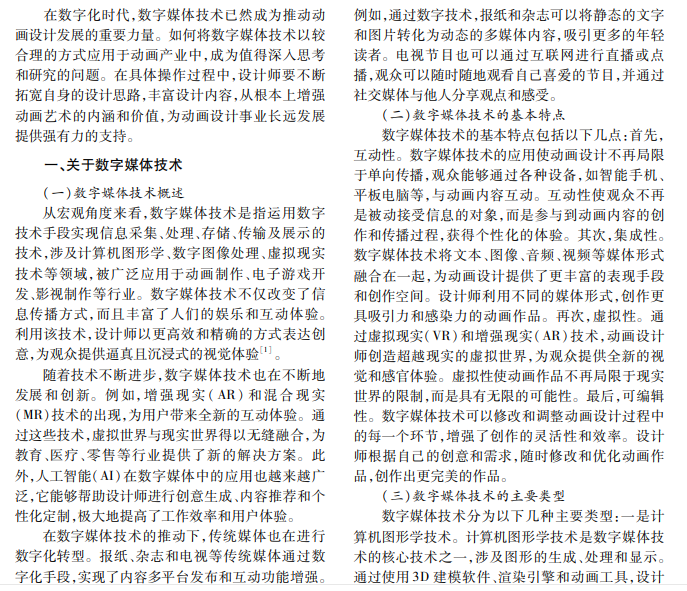 随着科技迅猛发展,数字媒体技术在动画设计领域扮演着越来越重要的角色。本文简要介绍数字 媒体技术和动画设计工作实际特点,结合具体情况分析数字媒体技术对动画设计产生的影响,并提出相应策 略,旨在促进动画设计工作现代化发展。